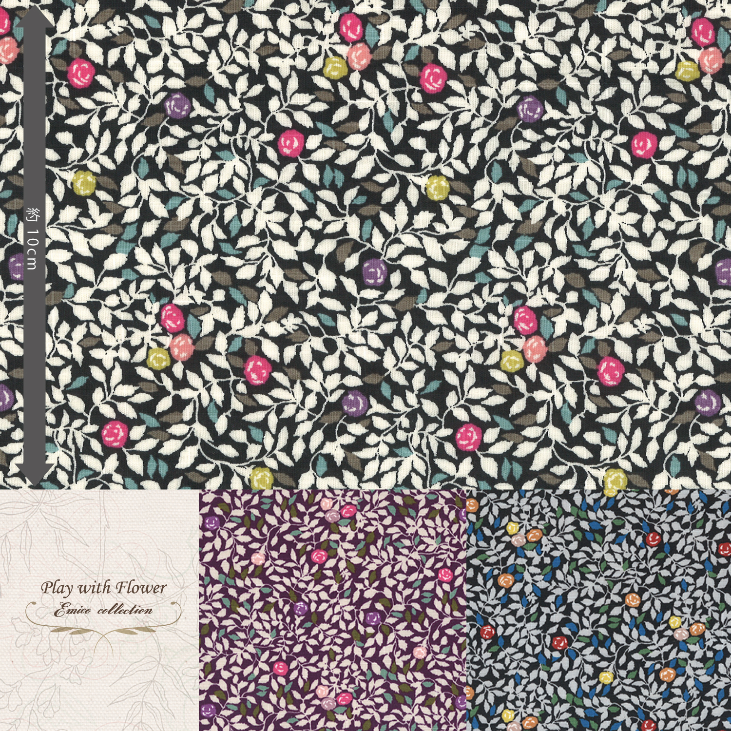 植物図鑑からの花、木の葉、実などのナチュラルなモチーフを、上品なカラーリングの都会的なプリント柄でアレンジした、シックで大人らしいファブリックです。