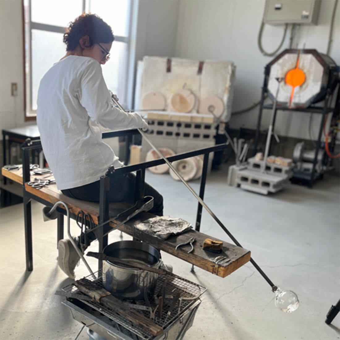 滋賀県大津の glass imecaの工房を訪れたのは冬のある日。柔らかい光が差し込み、窯の熱気で過ごしやすく感じるほど暖まった工房。夏になると一体どうなってしまうんだろうという不安が一瞬頭をよぎる。ガラスを溶かす1200度以上にも熱せられた窯の間を行ったり来たり、棒をくるくる回しながら、先端のとろとろに溶けたガラスに息を吹き込む姿には一定のリズムがあるようにも見え、ずっと眺めていたくなる心地よさだった。 glass imeca 神永 朱美さんに"つくる"について伺いました。