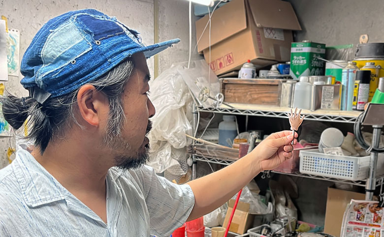 次の展覧会に向け制作中のスッポンの立体作品と大江さん