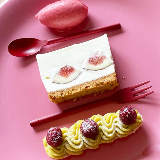 太陽プラムのソルベ、シェーブルと無花果のレアチーズケーキ、ピスタチオのダコワーズ