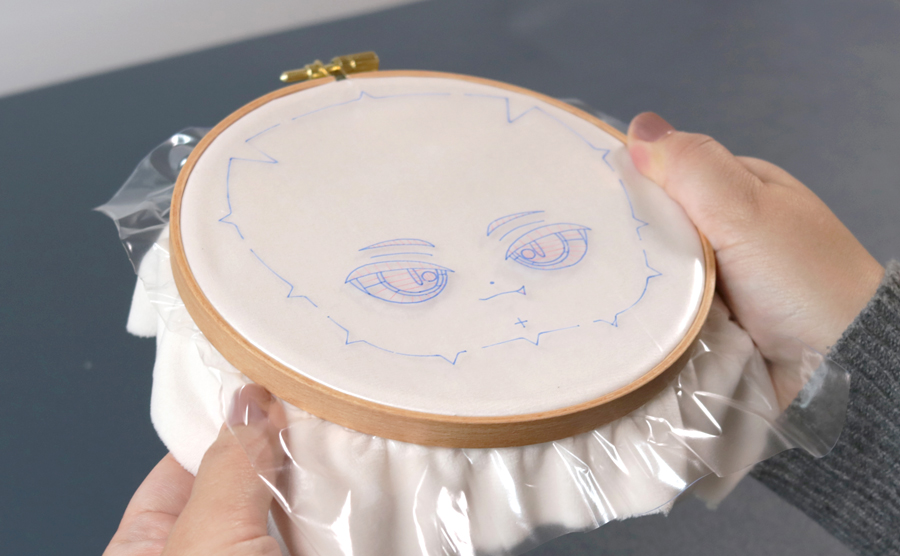 毛足の長い「ぬいクロスパウダーボア」のような生地は刺しゅうシートと生地の間がモコモコしやすいので、刺しゅうが浮かないようにしっかりめに引き締めます。