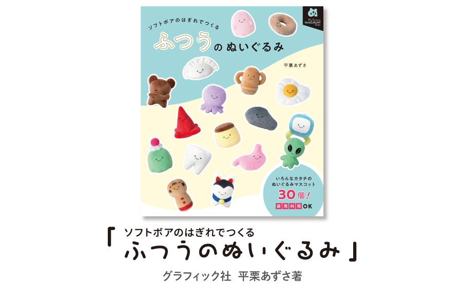 平栗あずささん著書の『ソフトボアのはぎれでつくる ふつうのぬいぐるみ』では、今回ご紹介したキットのモチーフのほか「たべもの」や「じんたい」など、現代の日常に潜む“ふつう”が大集合!