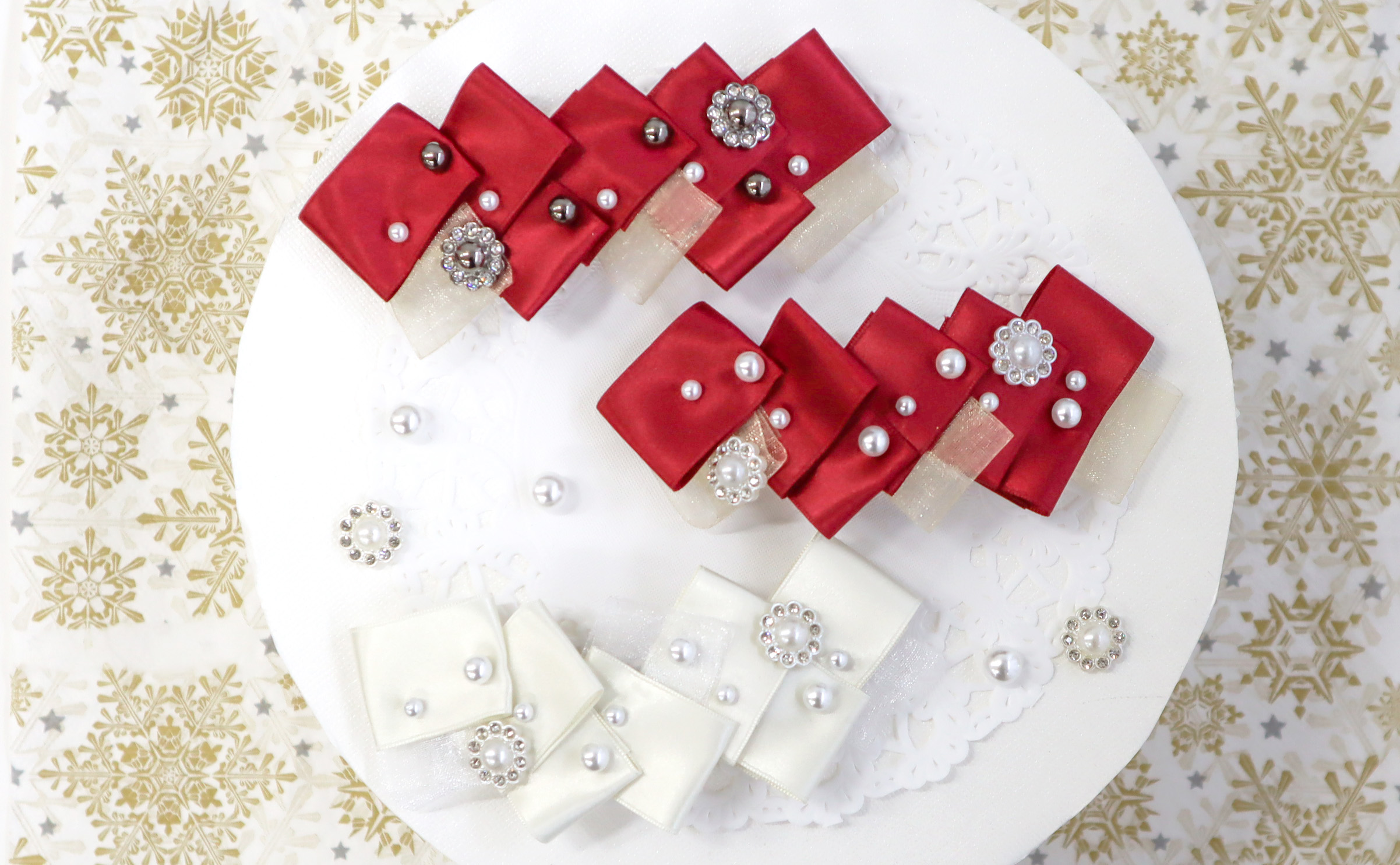 サテンリボンを2つ使い、<手順4>と同様にパールを打ち付けて固定し、同じパーツを2つ作ります。