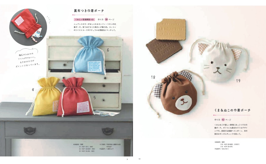 ブティック社から「かんたんに作れてかわいい!巾着ポーチとバッグ」にてココチファブリック、ハンドメイドコレクションを使用した巾着ポーチ、バッグが掲載されております。