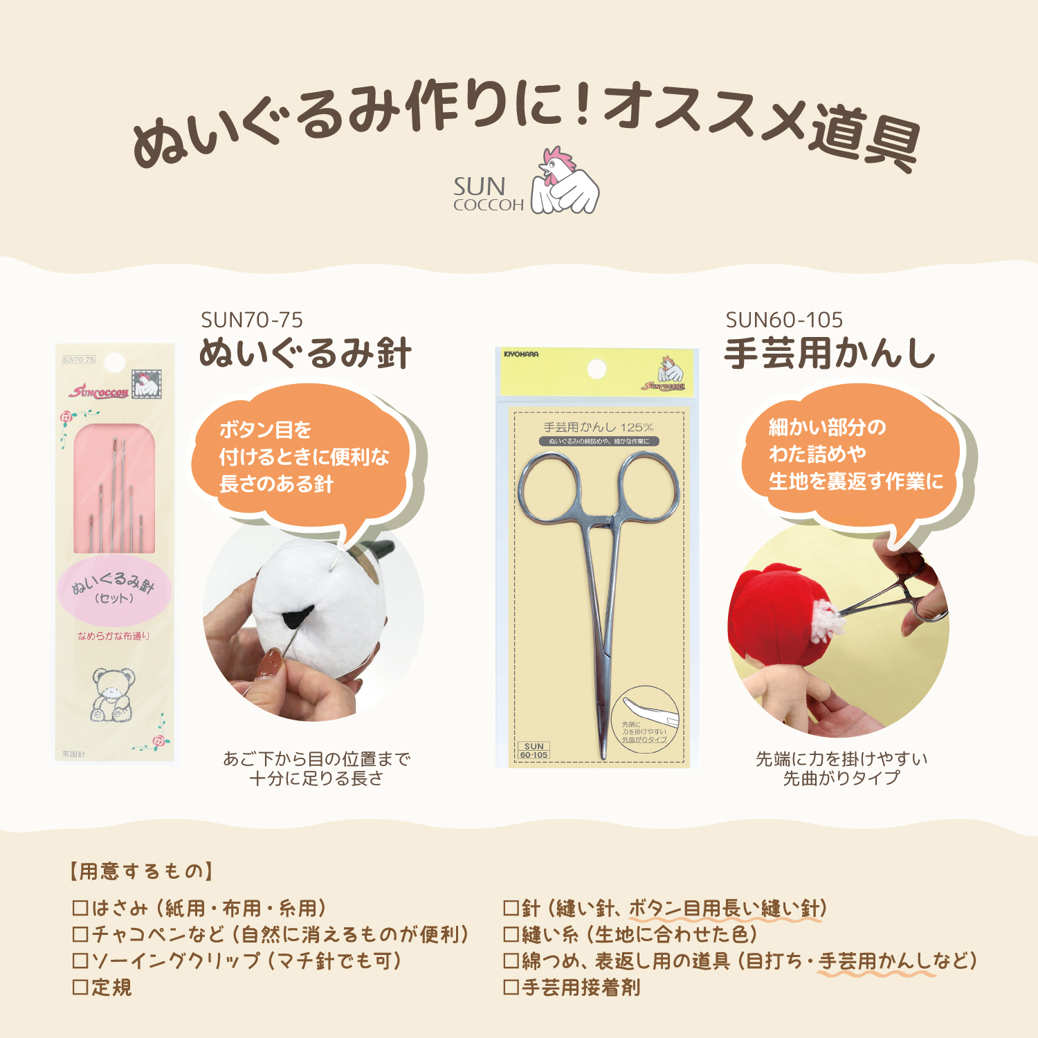 初心者の方にも優しい裁断済みの生地入りの他、顔の仕上げが簡単になるオリジナルのフェルトパーツ付きです。