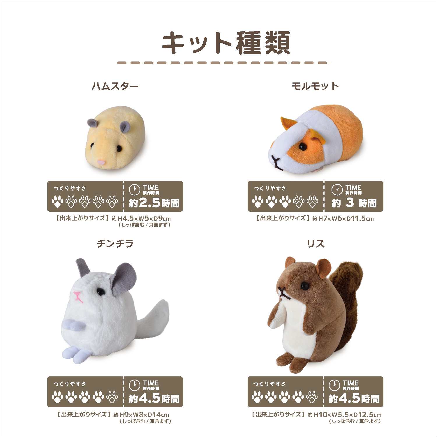 てのひらサイズがキュートな「ハムスター」「モルモット」、ふわふわでかわいい「チンチラ」や「リス」が作れるぬいぐるみキットです。