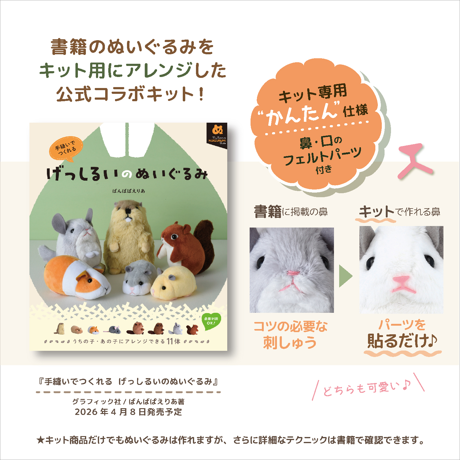 人気ぬいぐるみ作家「ばんばぱえりあ」さんの書籍「手縫いでつくれる げっしるいのぬいぐるみ」よりセレクトしたラインナップです。