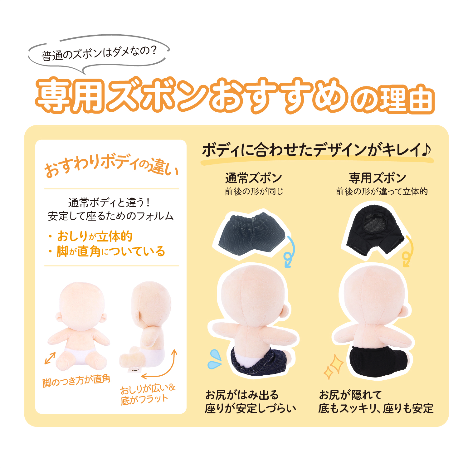 おすわりタイプのボディは立ちポーズのボディとおしりのフォルムが異なります。通常のズボンだとおしりがはみ出てしまうため、ボディにフィットする専用ズボンがキレイにはけてオススメです。ズボンは、「ぬいのボディwawaちゃんおすわりタイプ」のパッケージに封入されている型紙を使用しています。