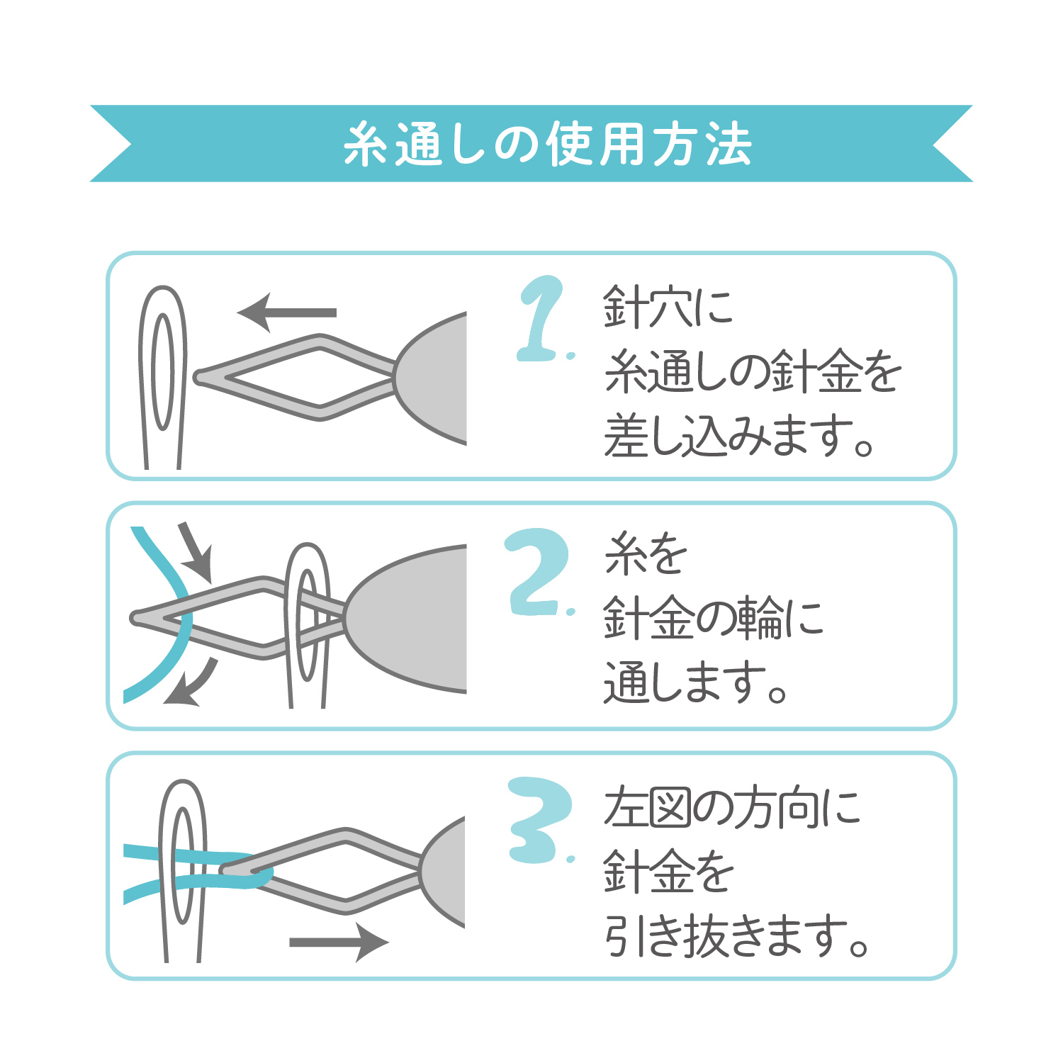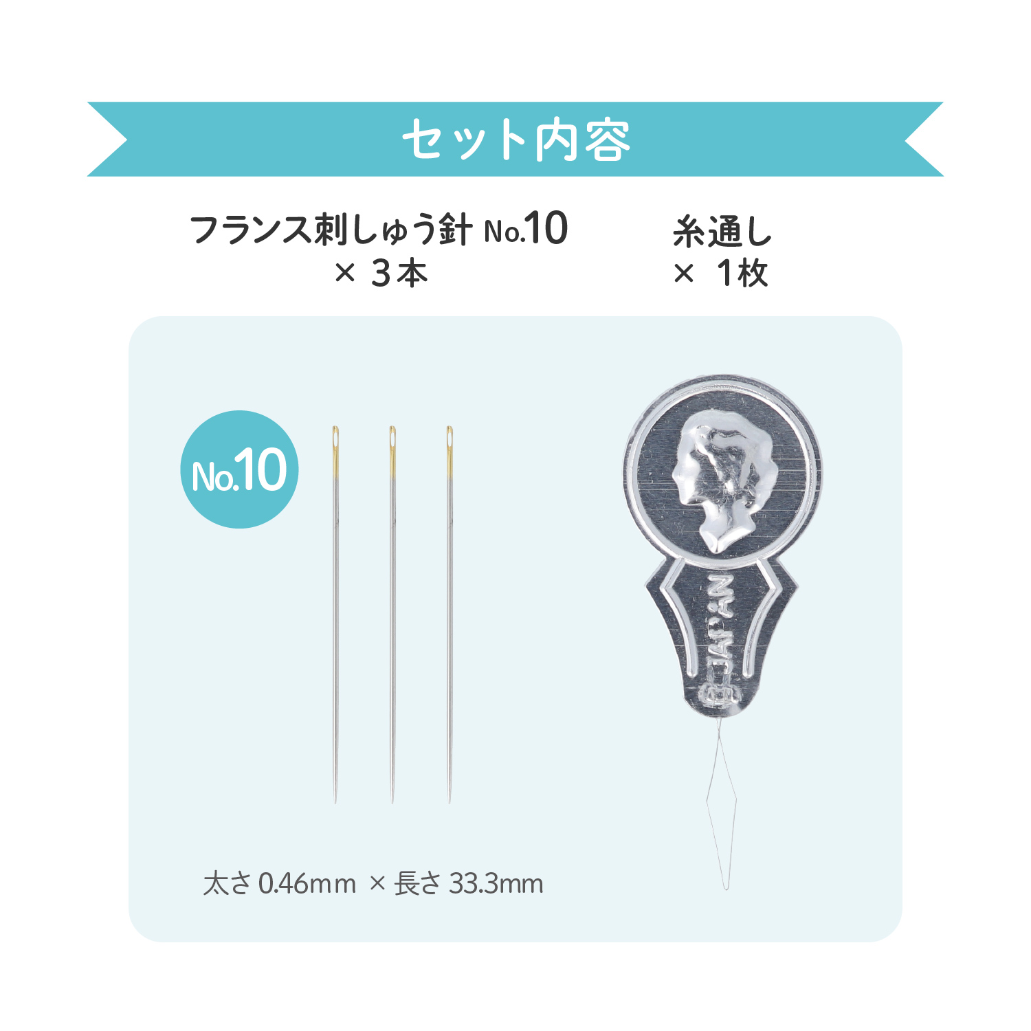 針は3本入りなので糸を通した針をキープできて作業も効率的に行えます。10号針のみだからサイズ間違いも防止!便利な糸通し付きでスムーズに作業ができます。