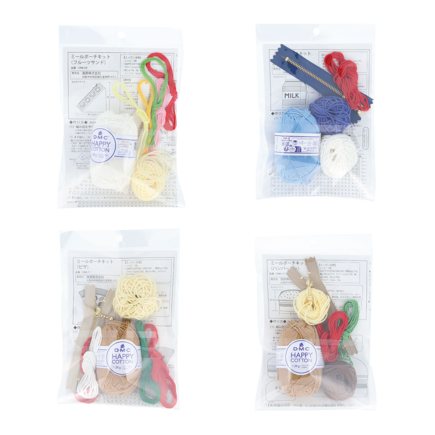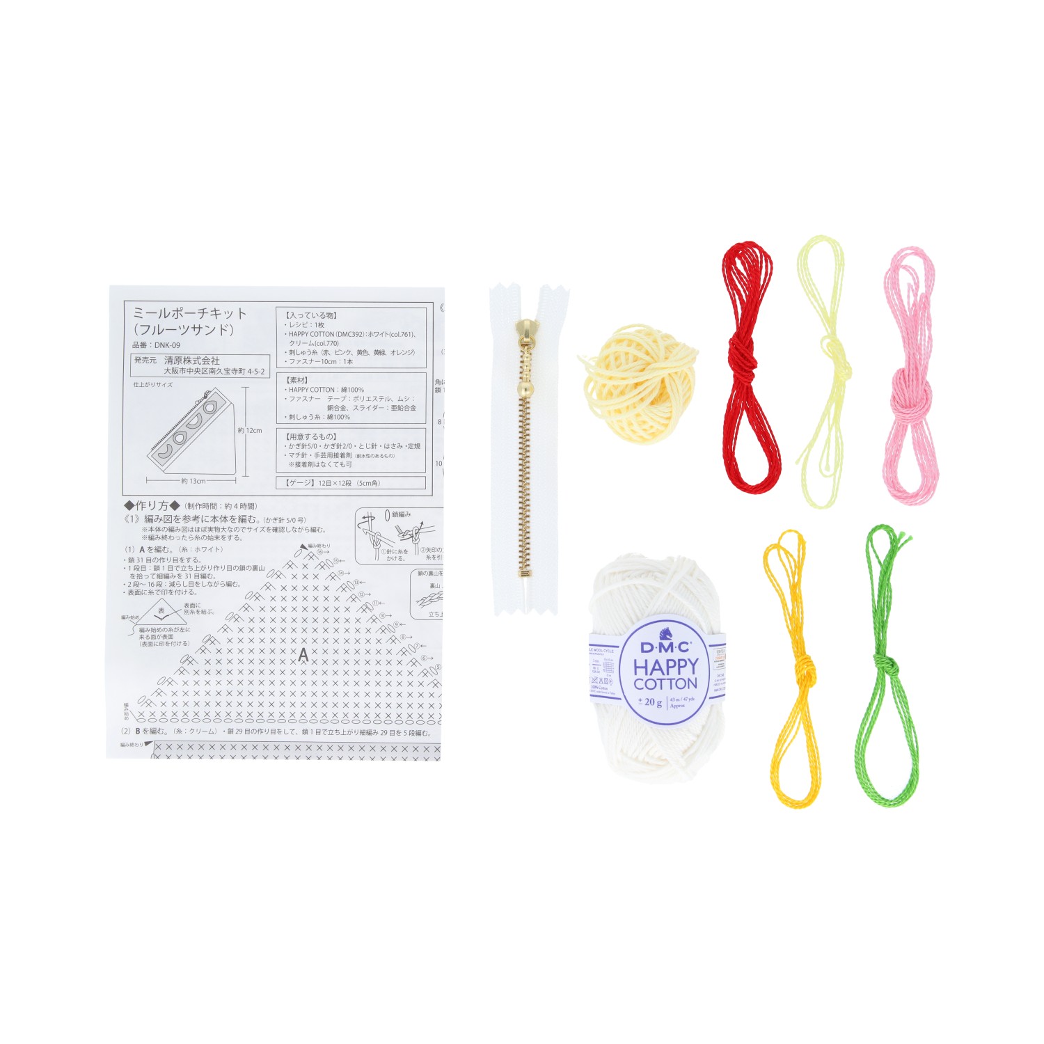 ポップなカラーで人気のディー・エム・シーHAPPY COTTONでつくる、かぎ針の編み物キットです。